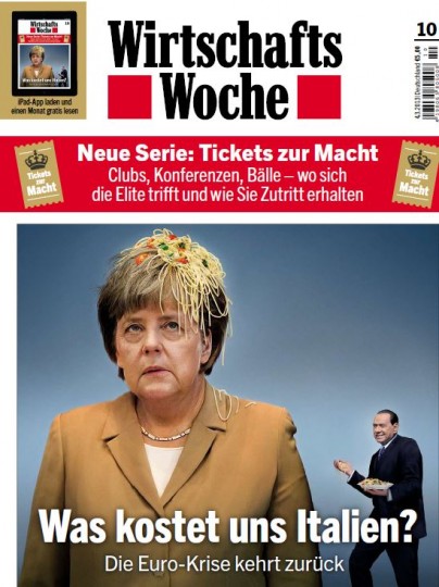 «Τι μας κοστίζει η Ιταλία;» διερωτάται στο εξώφυλλό του το γερμανικό οικονομικό περιοδικό Wirtschafts Woche, απεικονίζοντας το Σίλβιο Μπερλουσκόνι να πετάει μία μακαρονάδα στο κεφάλι της καγκελάριου της Γερμανίας.