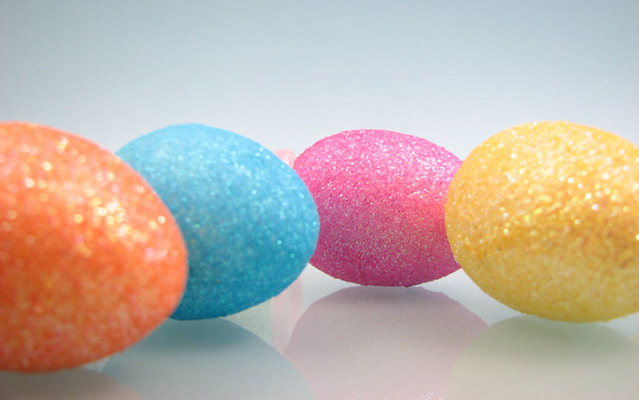 Γεμίστε ένα μπολάκι με γκλιτερ ή με μικρά ζαχαρωτά, απλώστε κόλλα στα βρασμένα αυγά και κυλίστε τα μέσα στο μπωλ μέχρι να κολλήσει ομοιόμορφα το περιεχόμενο σε όλο το κέλυφος.