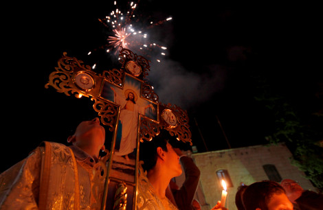 Παλαιστίνιοι χριστιανοί παρακολουθήσουν τα πυροτεχνήματα κατά τη διάρκεια της τελετής του Αγίου Φωτός σε μια ελληνική ορθόδοξη εκκλησία στην πόλη της Γάζας.