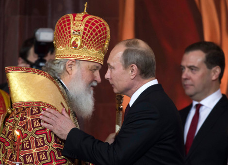 Ο Ρώσος Πατριάρχης Κύριλλος χαιρετά τον πρόεδρο της Ρωσίας Βλαντιμίρ Πούτιν, υπό την παρουσία του πρωθυπουργού Ντιμίτρι Μεντμέντεβ, στον καθεδρικό ναός του Σωτήρα στη Μόσχα.