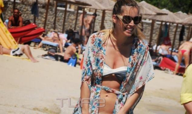 Λίγο πριν φύγουν βούτηξε στα καταγάλανα νερά με ένα δίχρωμο στράπλες μπικίνι αναδεικνύοντας την καλογραμμωμένη κοιλιά της! Τις εντυπώσεις έκλεψε και το φλοράλ καφτάνι της!