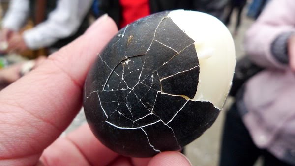 αποτελέσματα. Τα αυγά προέρχονται από κότες και το μαύρο χρώμα στο τσόφλι τους οφείλεται στον βρασμό τους μέσα στις θειούχες πηγές της περιοχής.