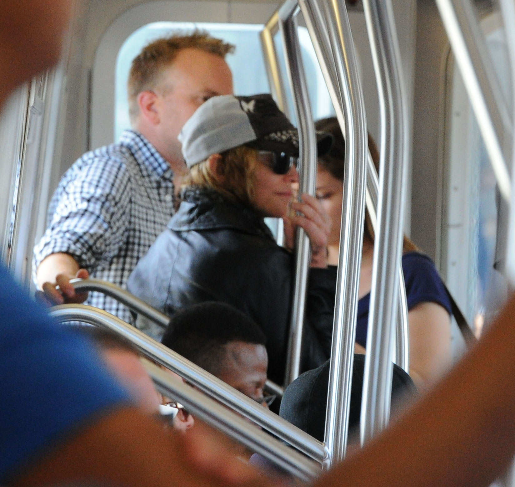 Σηκωμένος γιακάς, γυαλιά ηλίου, καπέλο κατεβασμένο μέχρι τα αυτιά: Κι όμως ναι, αυτή είναι η Μαντόνα στο μετρό της Νέας Υόρκης.