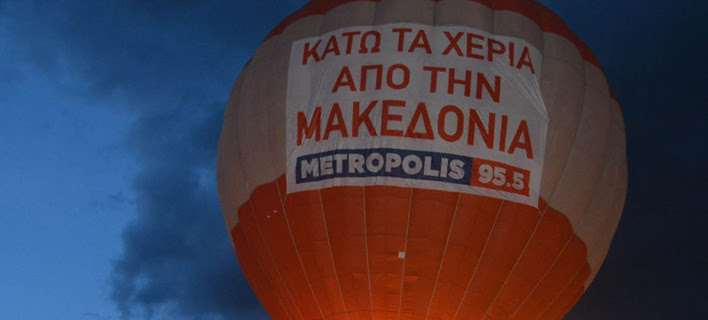 Ενα τεράστιο αερόστατο που γράφει «Κάτω τα χέρια από τη Μακεδονία»... σηκώθηκε το απόγευμα της Παρασκευής.