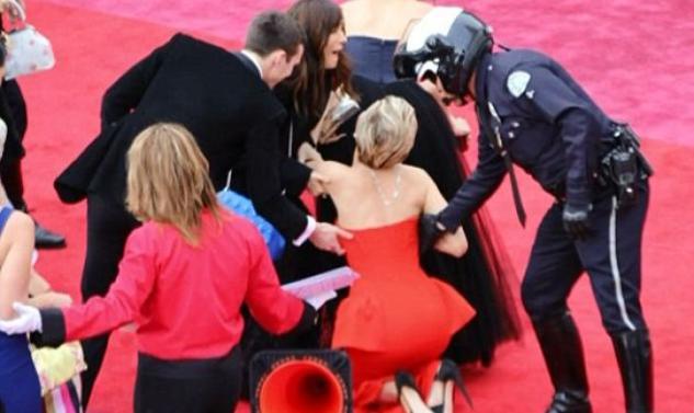 Δεν τα υπολόγισε όμως καλά, παραπάτησε και έπεσε στο red carpet μπροστά στους φωτογράφους. Μάλιστα την ώρα της πτώσης πήγε να παρασύρει μαζί της και τις υπόλοιπες celebrities που βρέθηκαν μπροστά της.